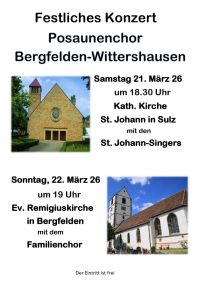 Auch die St. Johann-Singers unter der Leitung von Frau Hass-Scheuble und Marion Groth, proben unterschiedliche Lieder für den gemeinsamen Abend in Sulz. Der Posaunenchor bietet sein Programm zweimal dar, zunächst am Samstag den 21. März 2026, gemeinsam mit den St. Johann-Singers um 18:30 Uhr in der Kath. St. Johann-Kirche in Sulz. Am Sonntag den 22. März 2026 in der Ev. Remigiuskirche in Bergfelden um 19:00 Uhr. Der Posaunenchor Bergfelden - Wittershausen sowie auch die St. Johann-Singers, freuen sich schon heute auf einen regen Besuch.